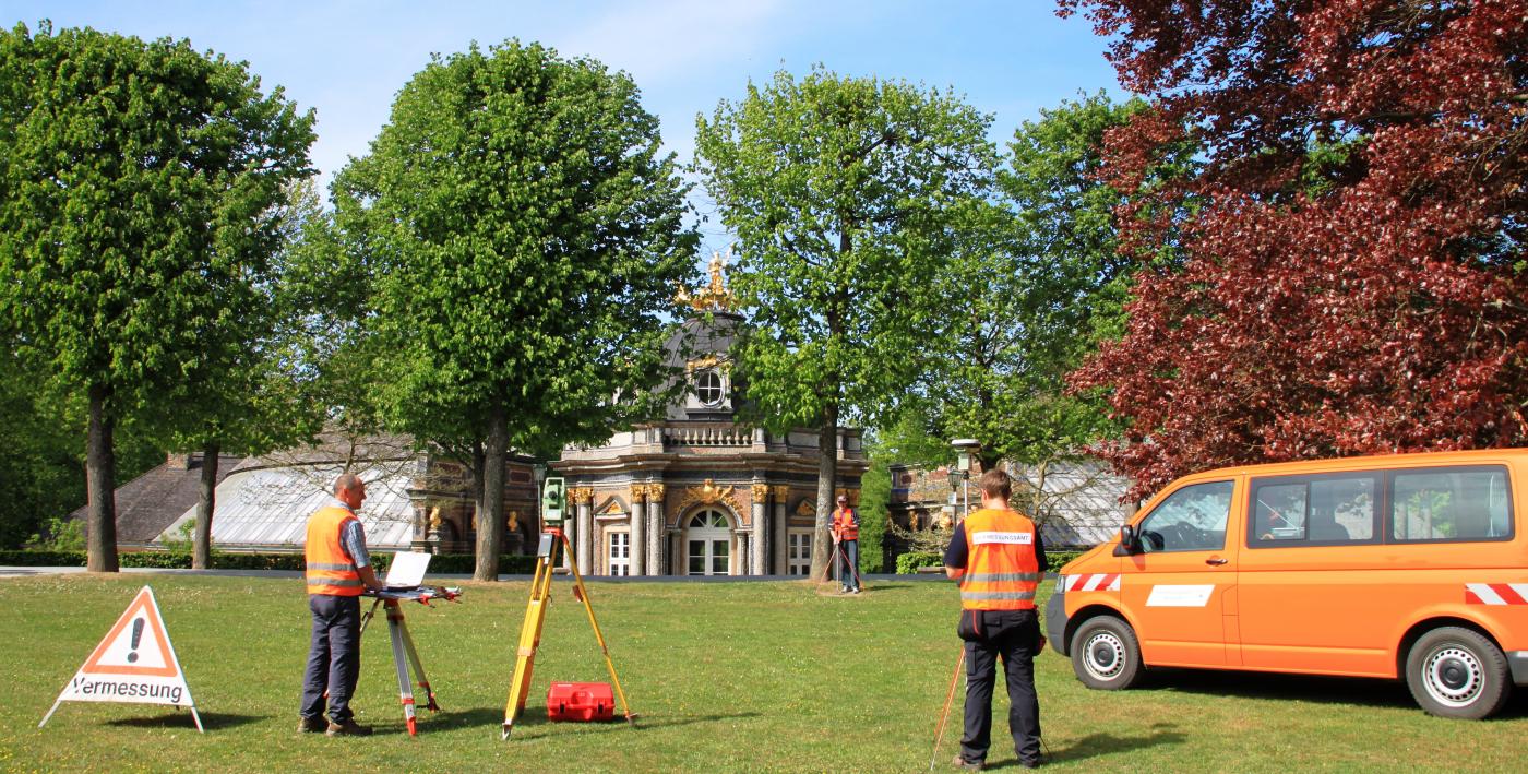 • Collage aus 4 Bildern: Vermessungsbus fährt über Brücke, Mann zeigt am Bildschirm auf die Flurkarte, Bagger gräbt eine Rinne für Leitungen, Vermesserin am Tachymeter vor Vermessungsbus